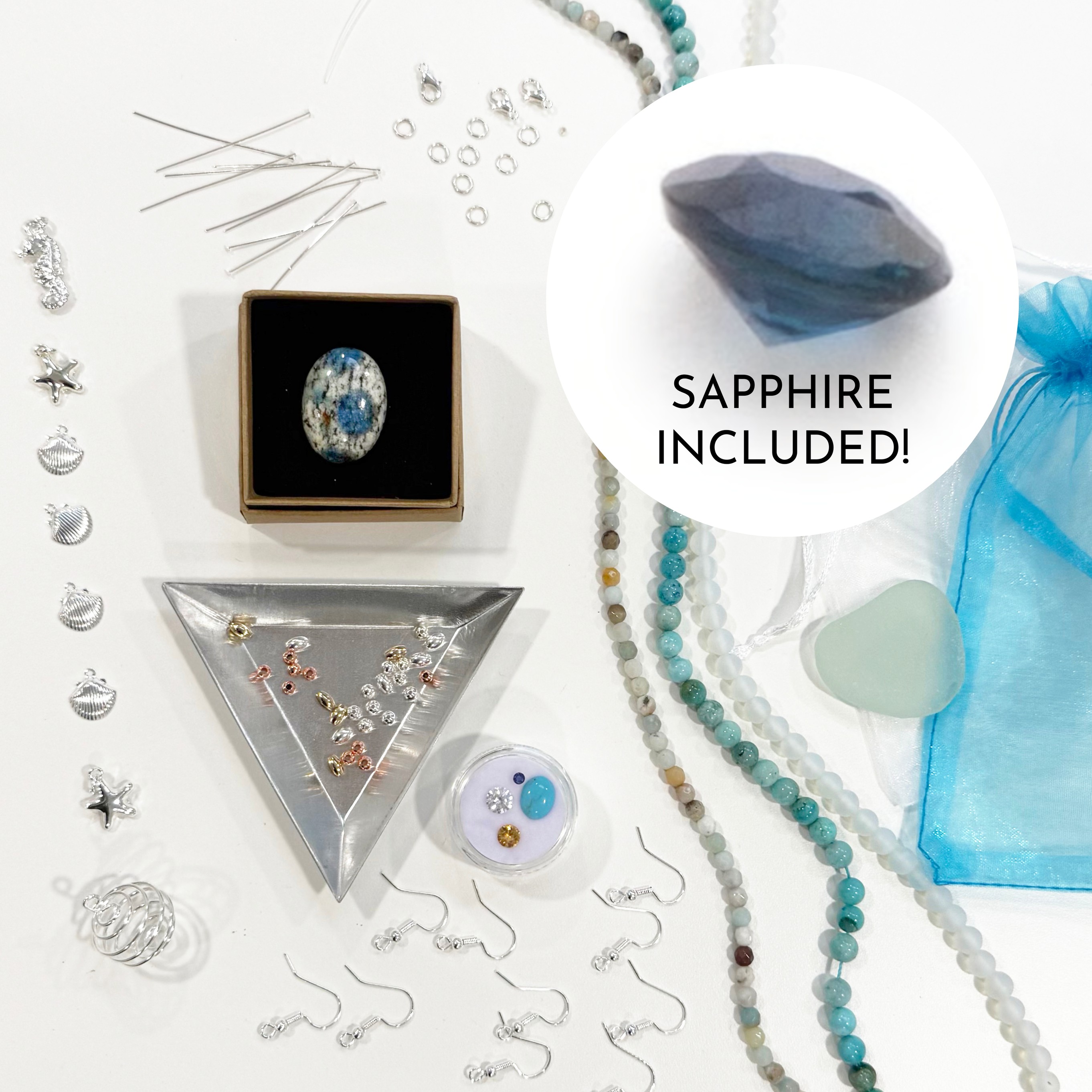 A beautifully curated jewellery making supplies box inspired by the sea and shoreline tones.